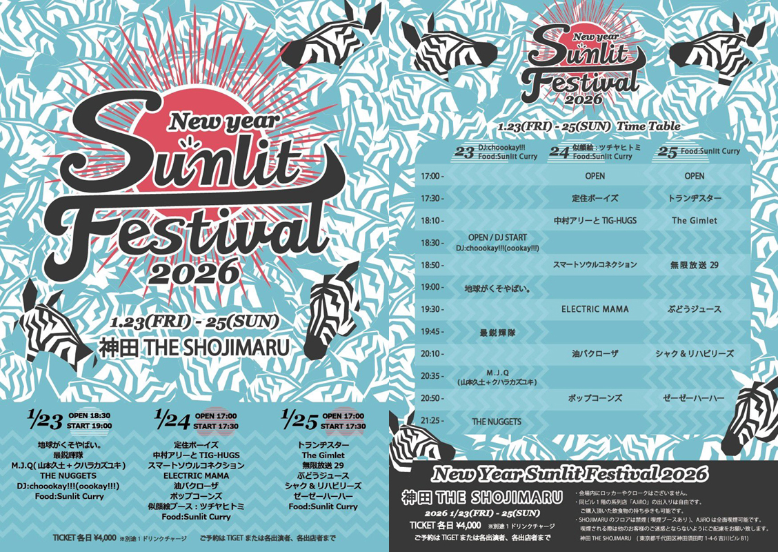 松戸にあるハンバーガーショップ<SUNLIT BURGER>が主催するデリシャスなイベント【新春SUNLIT FESTIVAL 2026 DAY2】で、スマートソウルコネクションが新年初ライブをお届け!