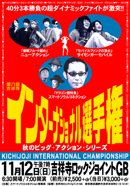 8回目を数える【 吉祥寺インターナショナル選手権 】。今回は、ゴーゴーなダンス・サウンドで乗り散らかすゴキゲンなグループが集結し、秋にピッタリなビッグ・アクションを炸裂させます!ご期待下さい!
