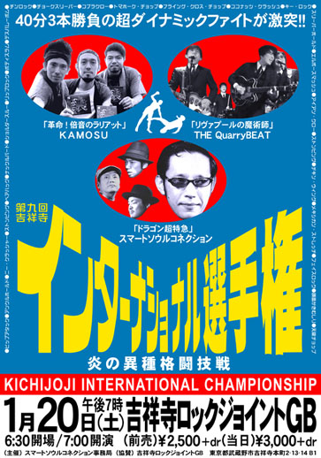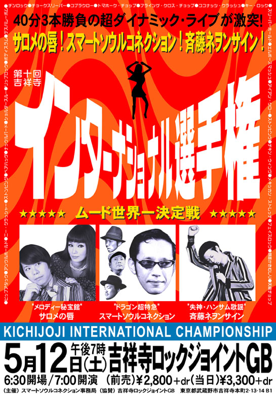 スマートソウルコネクション主催のイベント<インターナショナル選手権>が、今年も吉祥寺で開催!共演は、超新感覚のアジアン倍音ポップス・バンド<KAMOSU(カモス)>!そして、ビートルズのトリビュート・バンド<THE