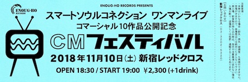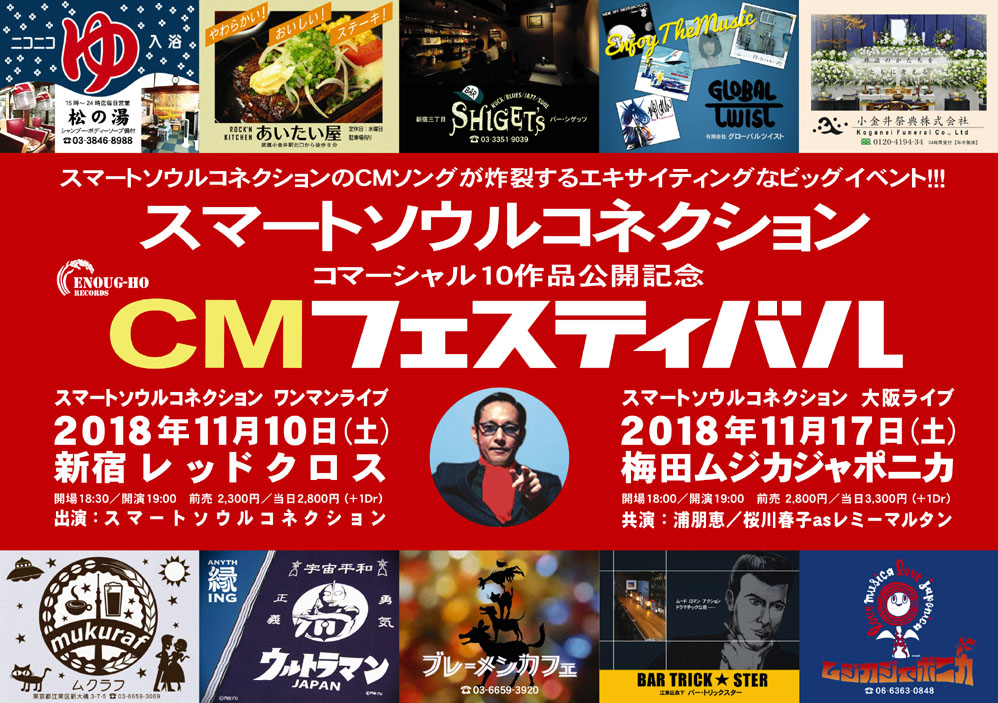 スマートソウルコネクションがコマーシャルソングを披露し散らかした『CMフェスティバル』。”店名連呼”というCMソングの基本スタイルを貫いた全20曲を演奏、お客様の体を揺らして会場は大盛り上がり!気をよくしたスマートソウルコネクションはイベントタイトルを盾にして、ここぞとばかりに商売っ気タップリなグッズ宣伝をしつこく敢行。アタッシュケースTシャツなどのスマコネ・グッズをたくさんご購入いただきました!ありがとうございました!そしてご来場頂きました皆様、誠にありがとうございました!!