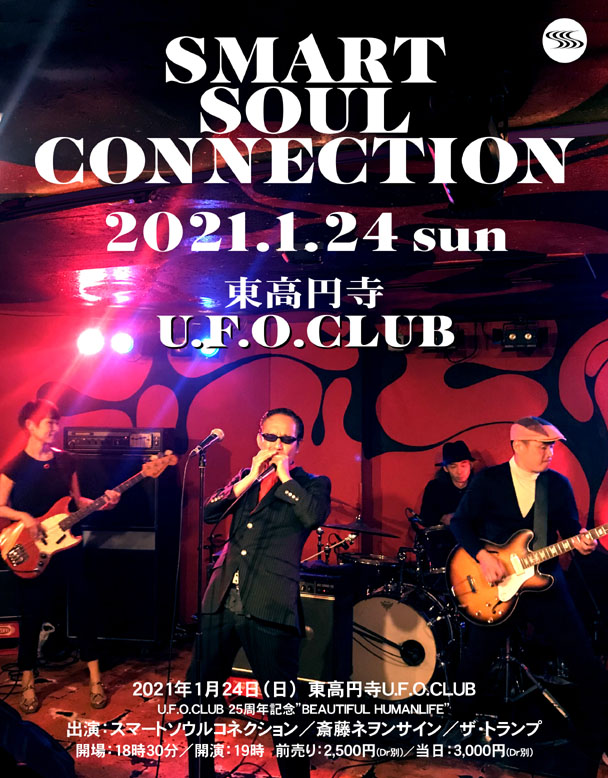 来年2021年1月24日(日)東高円寺U.F.O.CLUBにて、凄くニューサウンドなスマートソウルコネクション・ライブをドドーンとお届けします。どうぞご来場ください!只今前売り予約受付中!!